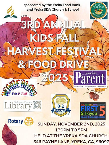 We want to thank the Yreka SDA church & School for co sponsoring the event with us at the Yreka Food Bank as well as being the host for the harvest festival. Also hosting two activity stations this year.
